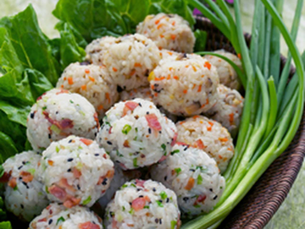Rinse the rice with fresh cold water in a sieve and mix with a spoon to ensure the rice is thoroughly washed before cooking. Form it into a sticky rice ball. Use short-grained sushi rice and cook according to the. 100 grams of rice 25 grams of ground pork 25 grams of carrots 15 grams of onions 3 slices of seaweed and 2 grams of cooked white sesame seeds. Add about another tablespoon of rice on top of your fillings. Now its time to get it ready for frying and thats where you need the other 2 eggs and the breadcrumbs. Lightly beat the eggs in a bowl and dip the rice ball in the egg and then coat it in the breadcrumbs. Lay Out the Ingredients. With moistened hands roll into a ball about the size of a golf ball.